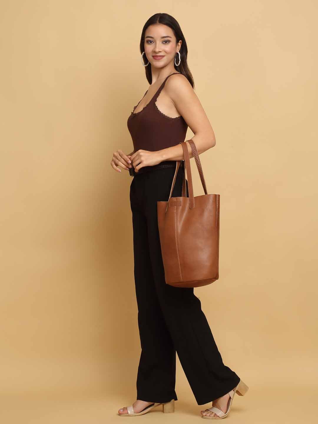 Elevate your everyday style with this sophisticated Suvaska leather tote bag for woman in a rich tan brown shade. This versatile handbag features a spacious design perfect for carrying all your daily essentials, complemented by sturdy double handles for comfortable shoulder carrying.