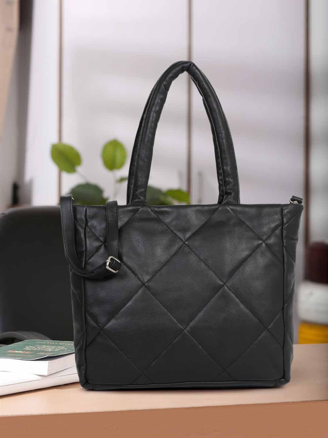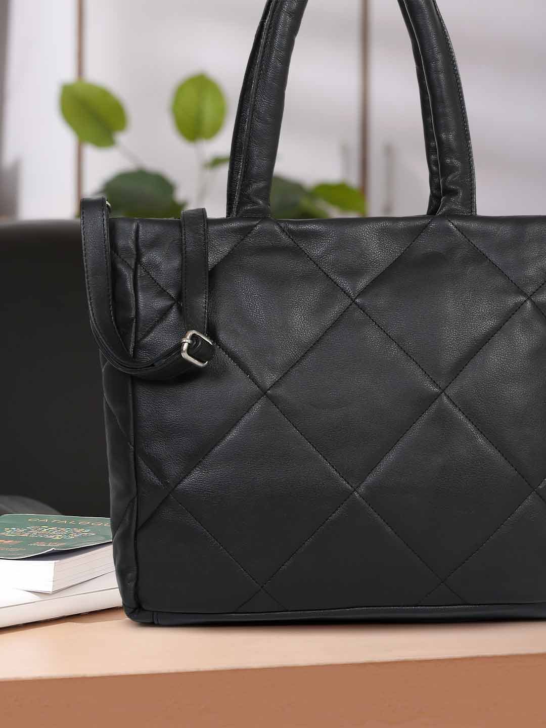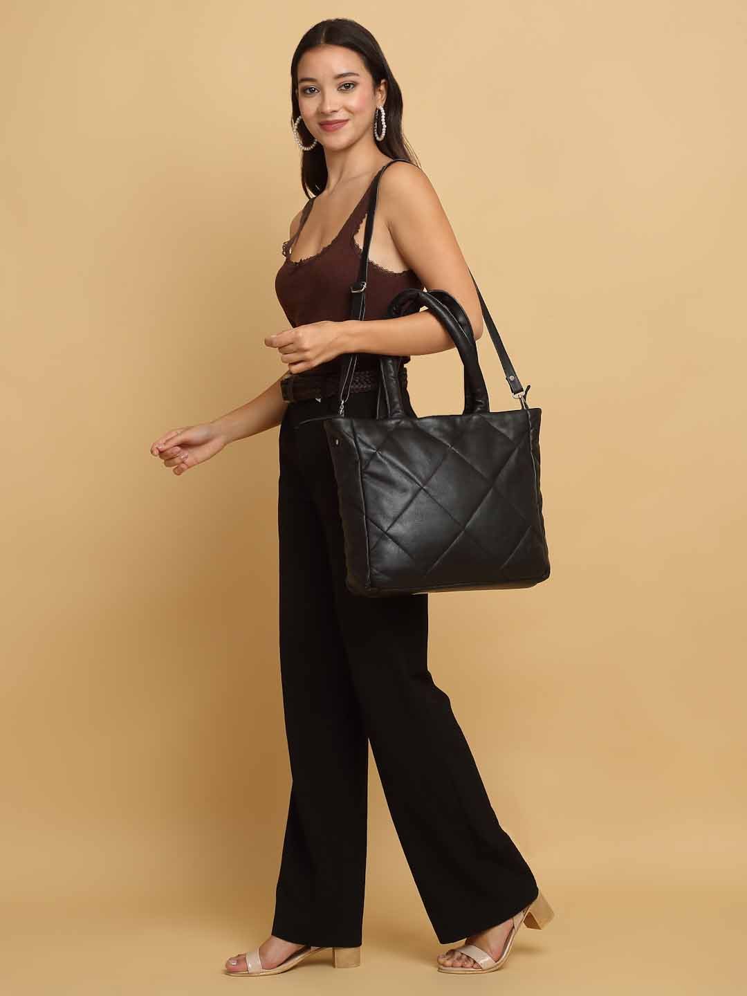 Suvaska Quilted Leather Tote Bag for Women | Black Montclair handbag | Premium-Quality Genuine Leather |